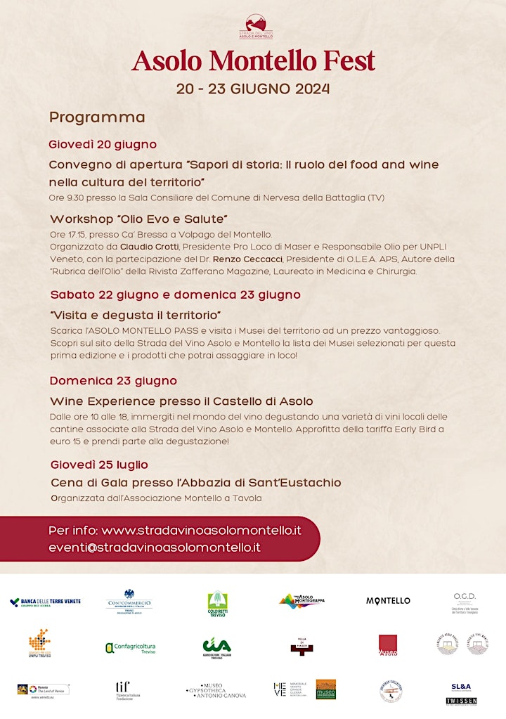 Il Festival, realizzato dall'Associazione Strada del Vino Asolo e Montello e patrocinato anche dal Comune di Asolo, inizierà giovedì 20 giugno con un convegno tematico d'apertura, che si terrà nella Sala Consiliare del Comune di Nervesa della Battaglia.