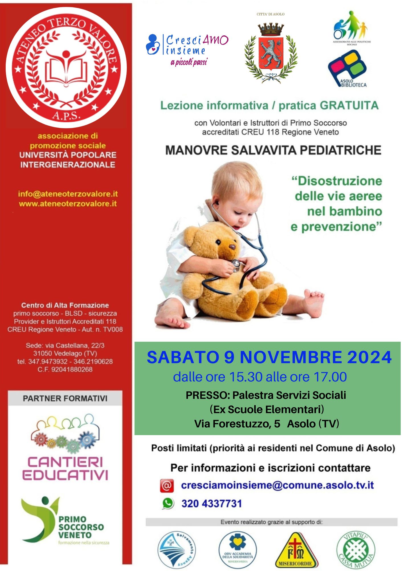Organizzato dal Comune di Asolo in collaborazione con la Cooperativa "Il Girotondo" che gestisce il Nido Comunale. Il corso è inserito all'interno del progetto CresciAMO Insieme a piccoli passi che ha come obiettivo quello di accompagnare i genitori (e non solo) nel percorso di crescita dei propri figli. È un'occasione importante per conoscere le procedure salvavita del bambino piccolo per saper prevenire e saper intervenire in caso di necessità.