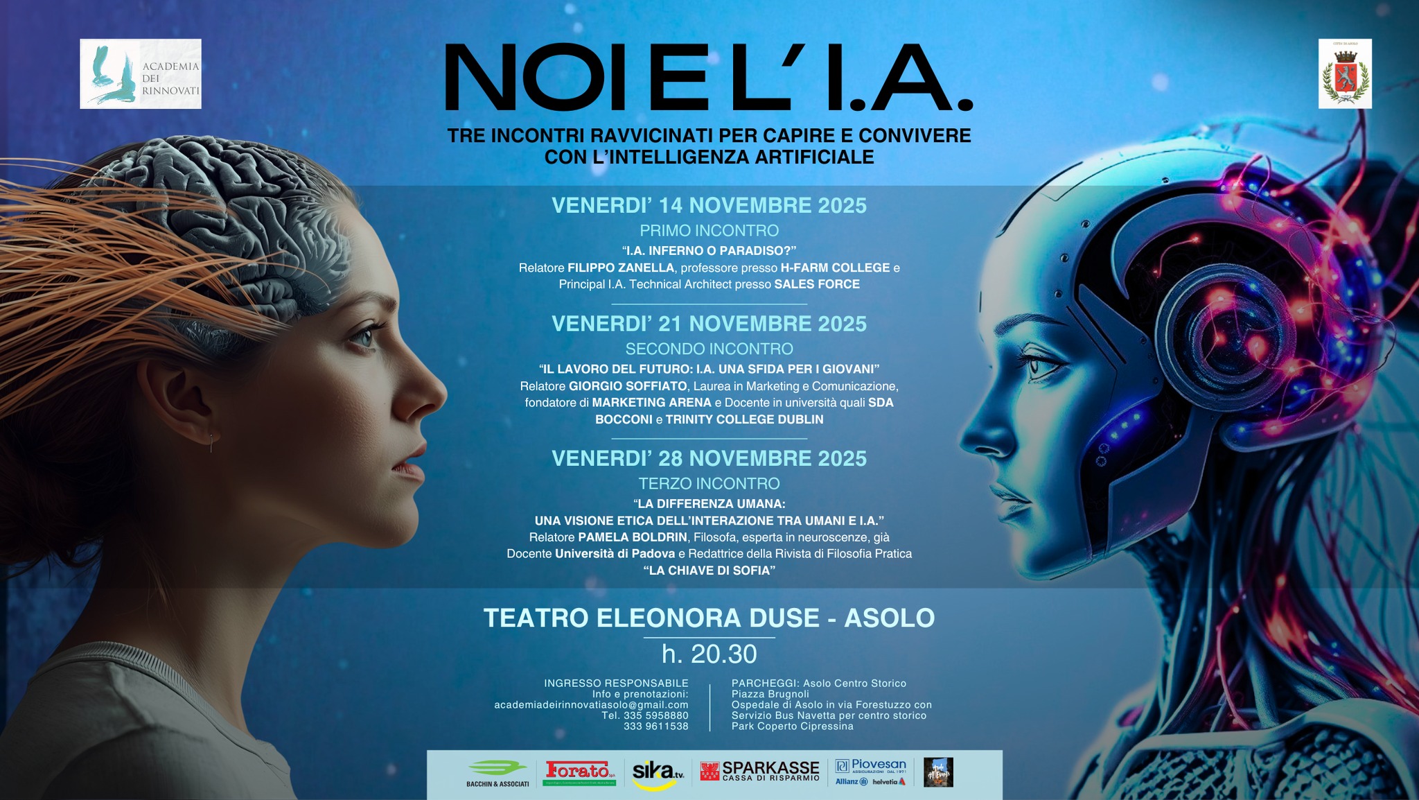 L'Academia dei Rinnovati di Asolo ha organizzato, nel mese di novembre, tre importanti incontri, nel Teatro Duse, dedicati all'intelligenza artificiale, allo scopo di esplorare e mettere quanto più possibile in luce le tematiche legate a una invenzione che condizionerà in modo significativo l'esistenza della nostra e delle prossime generazioni.