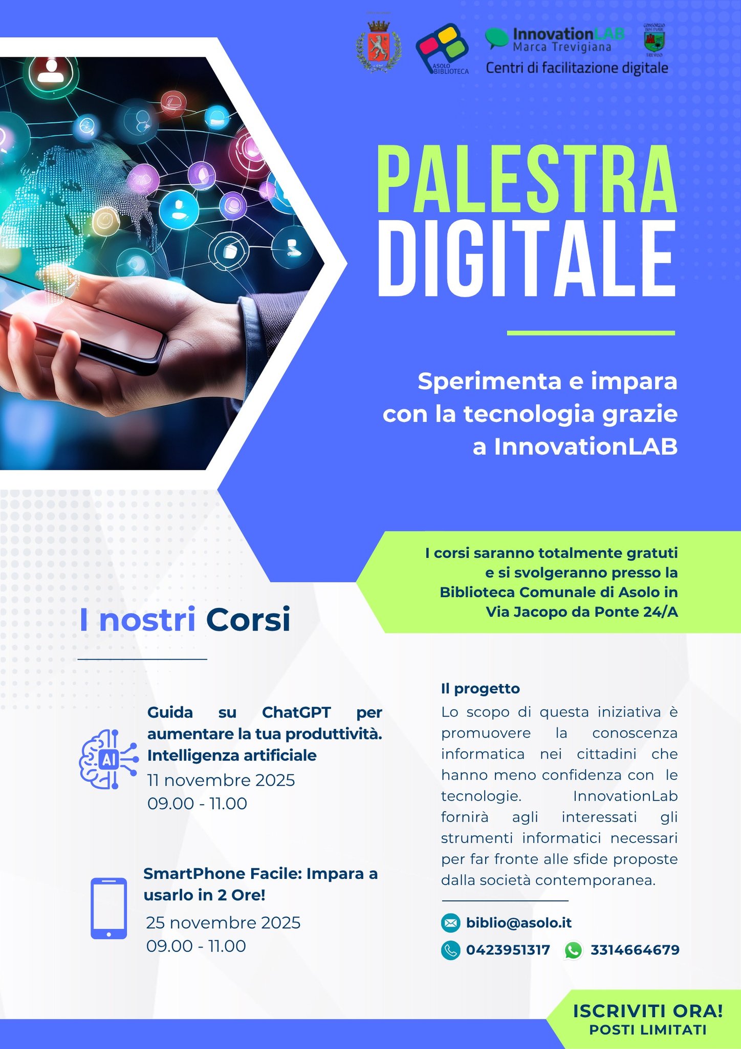I corsi sono gratuiti, ma è richiesta la prenotazione ai seguenti contatti: biblio@asolo.it - 3314664679 (WhatsApp) - 0423951317